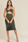 A solid fitted ruched midi dress with front cutout and strap details. Dress is lined.