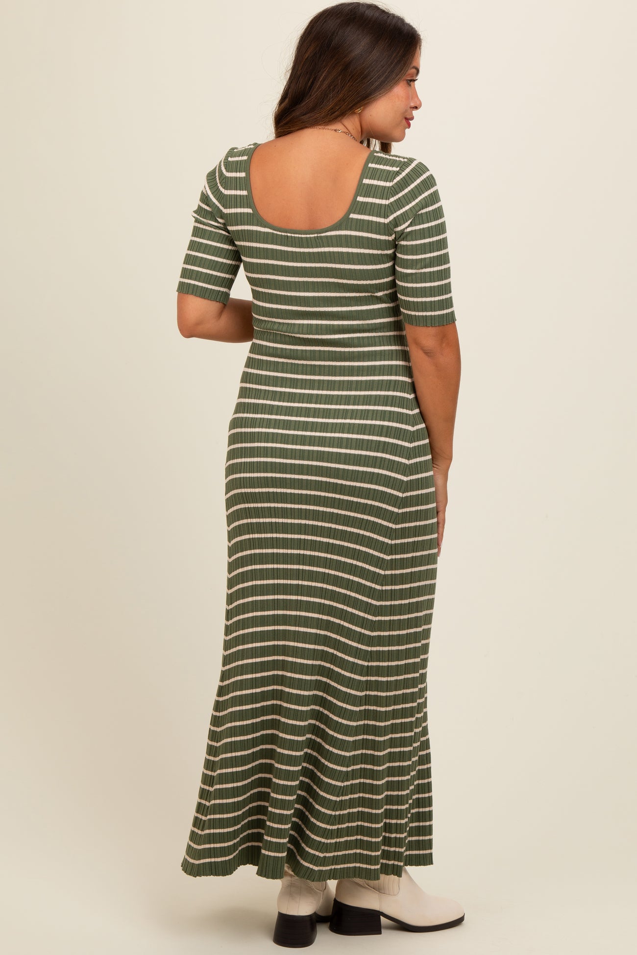 Olive Striped Ribbed Short Sleeve Maternity Maxi Dress