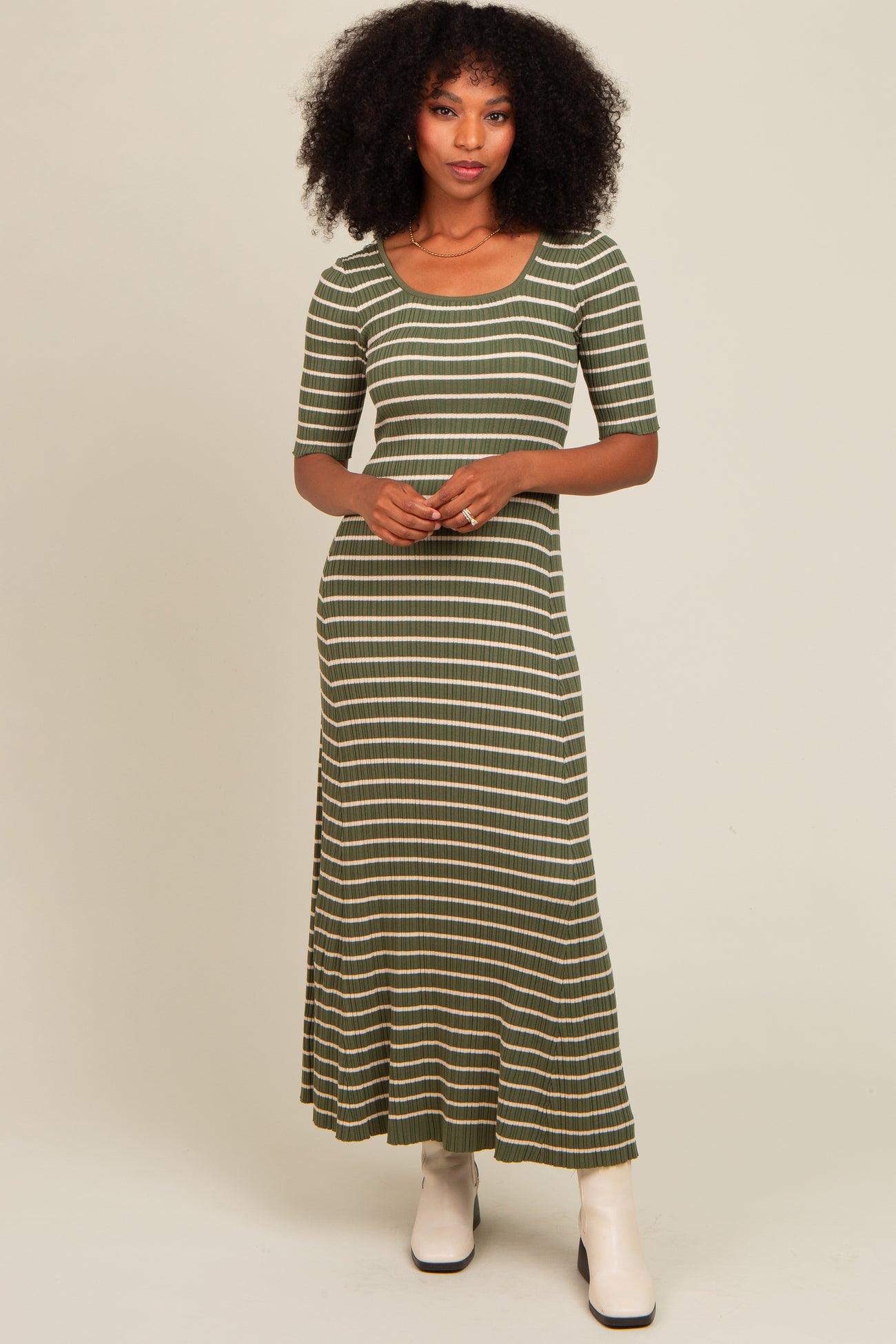 Olive Striped Ribbed Short Sleeve Maxi Dress