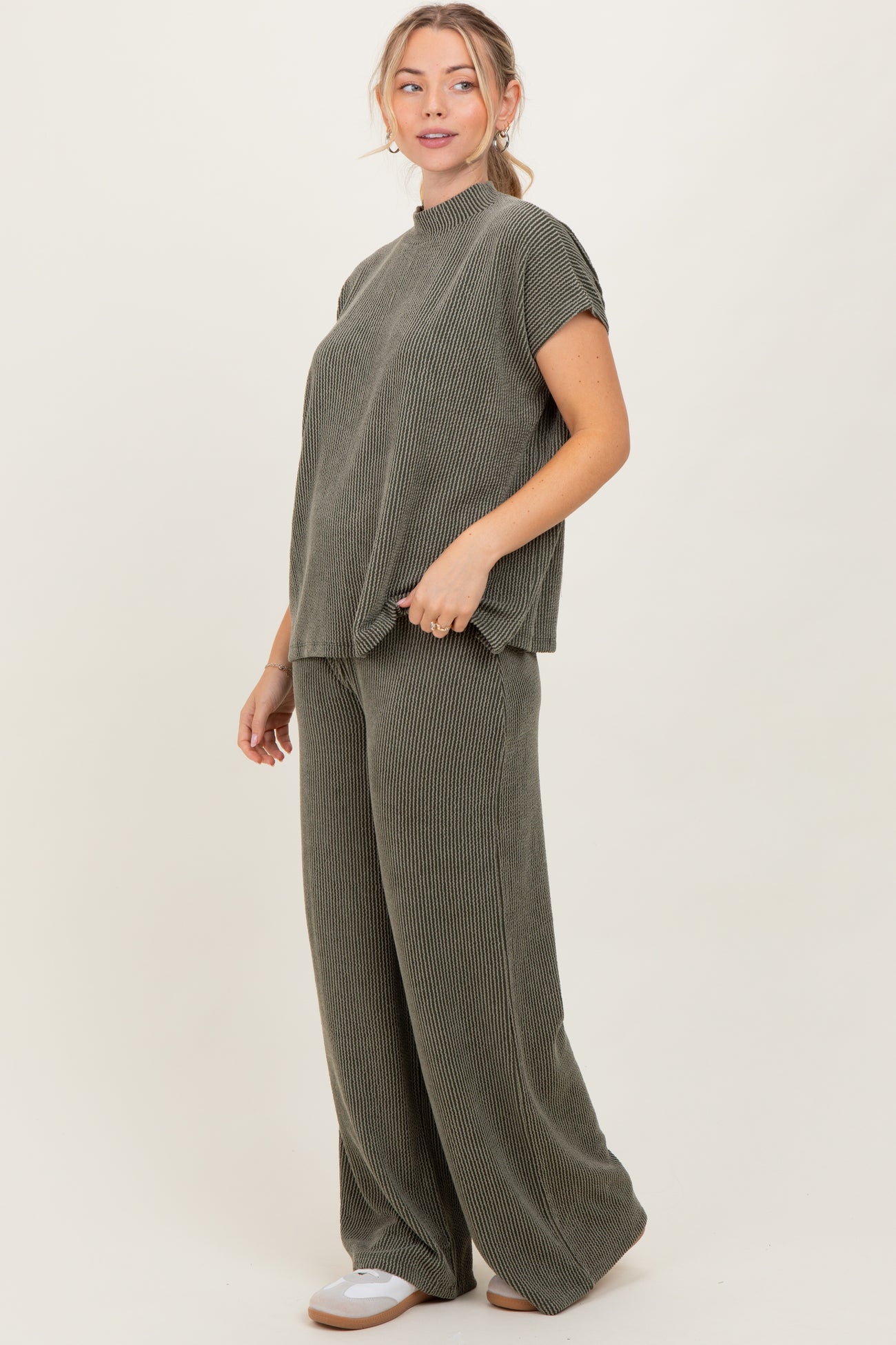 Olive Textured Rib Mock Neck Short Sleeve Pant Set