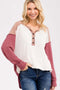 Embrace cozy style with our Olive Waffle Knit Colorblock Top. This tranquil top features a unique colorblock design with olive green sleeves, soft blush shoulders, and a crisp ivory body that adds effortless charm. Crafted from a comfy waffle-knit fabric, it showcases a relaxed fit, long sleeves with thumb holes, and a stylish henley neckline with three buttons for added detail. Perfect for layering or wearing on its own, this versatile piece pairs beautifully with your favorite jeans or leggings. Stay warm and chic all season long with this must-have colorblock top!
