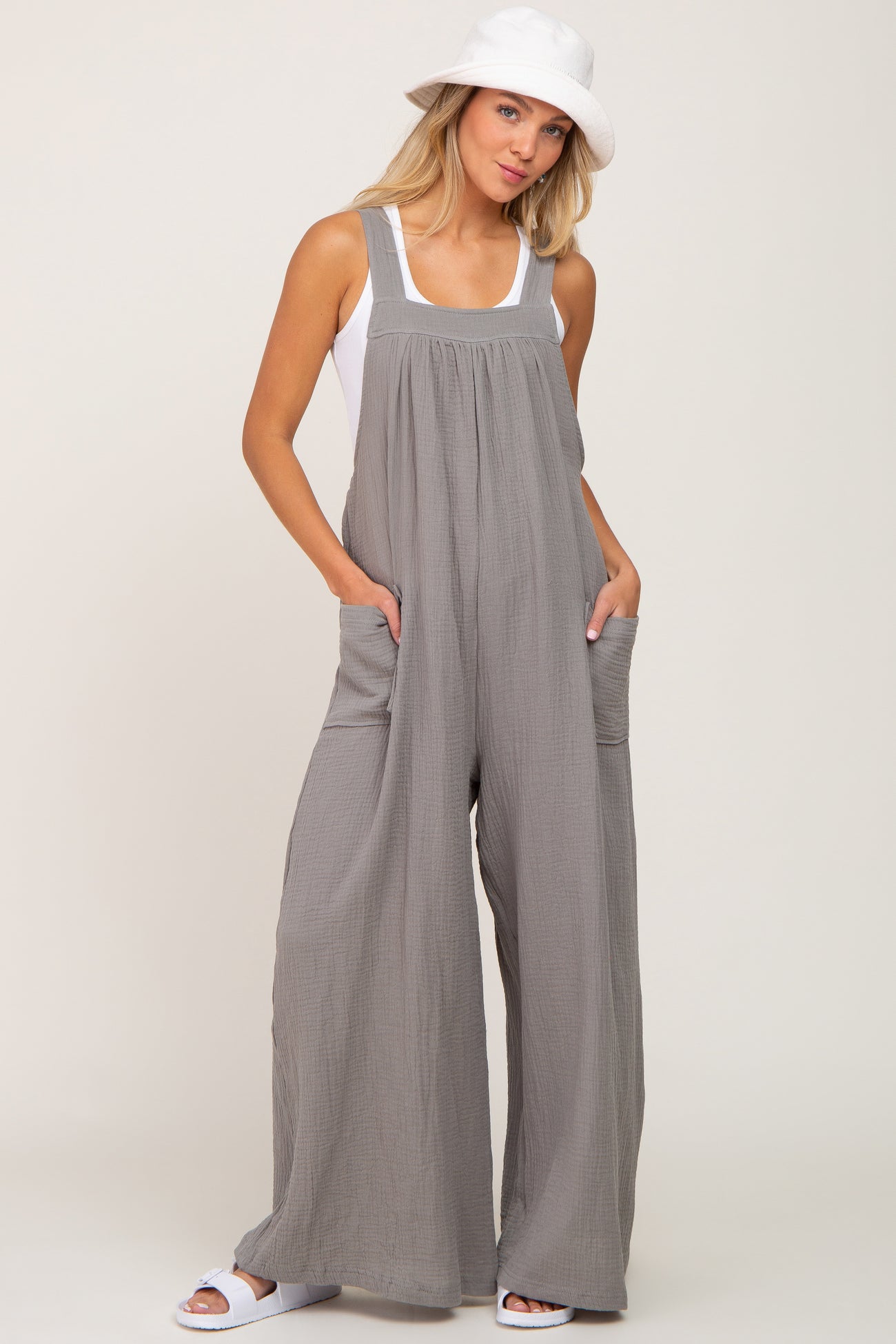 Details A solid cotton overall with tie back detail and wide legs. Content + Care