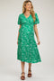 A solid maxi dress with short sleeves, v-neckline, button detail on chest, and tiered skirt. Dress is double lined.