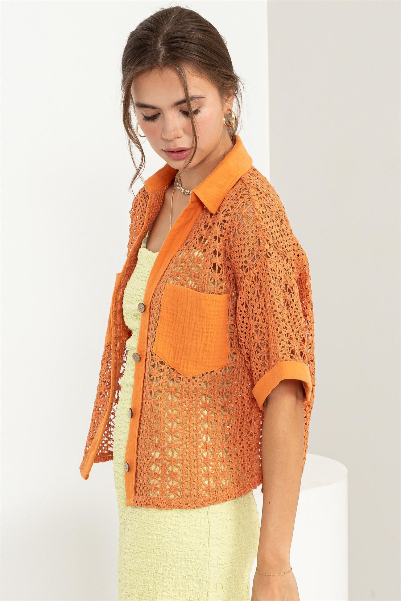 Orange Crochet Button-Front Top