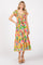 A floral midi dress with a smocked top, short flounce cap sleeves, a waist tie, and a gathered bottom tier. Dress is fully lined.