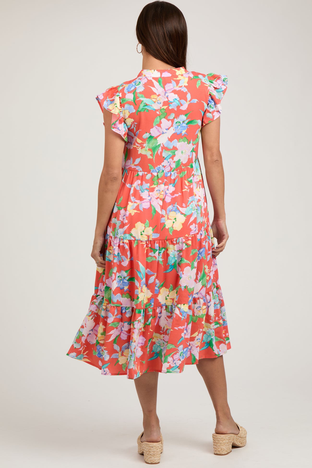 A floral print maternity dress featuring ruffle flutter sleeves, a tiered skirt, side pockets and a v-neckline.