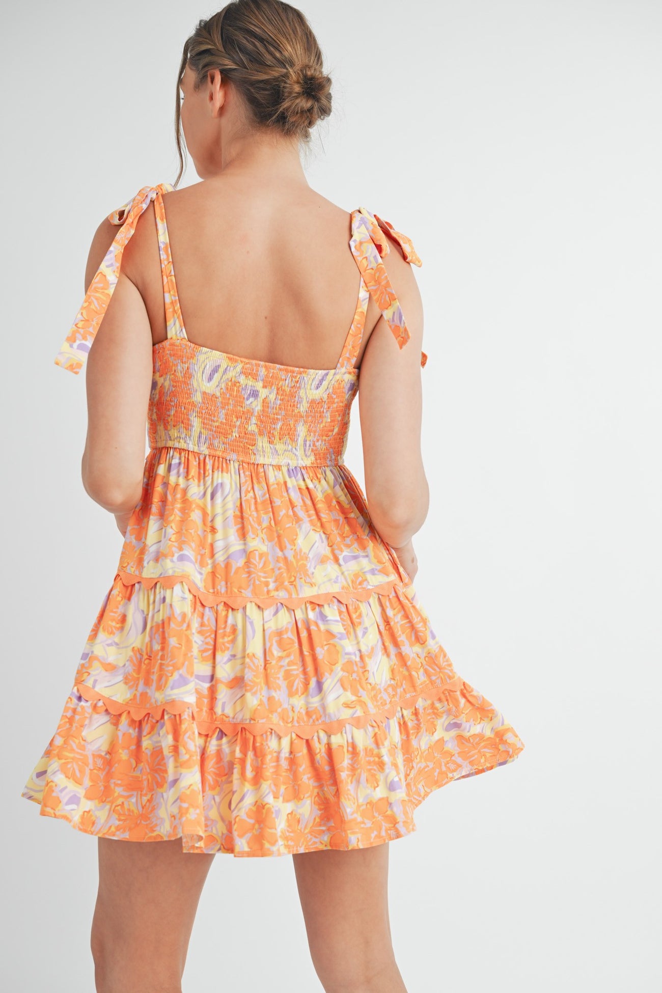 Orange Lavender Floral Tiered Scallop Trim Mini Dress
