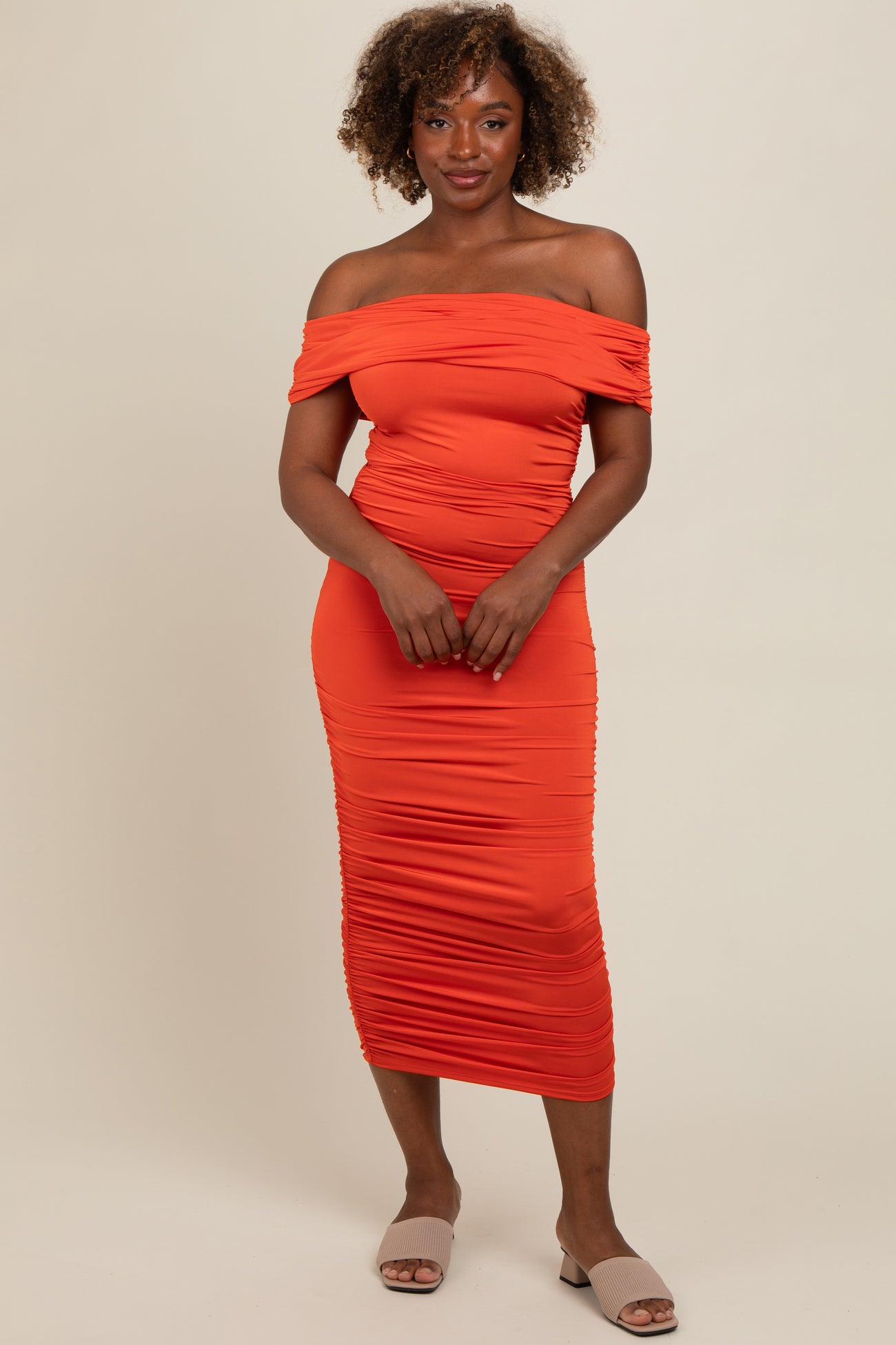 Orange Off Shoulder Ruched Maternity Midi Dress