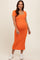 A solid ribbed fitted maternity midi dress with short sleeves, a square neckline, and back slit.