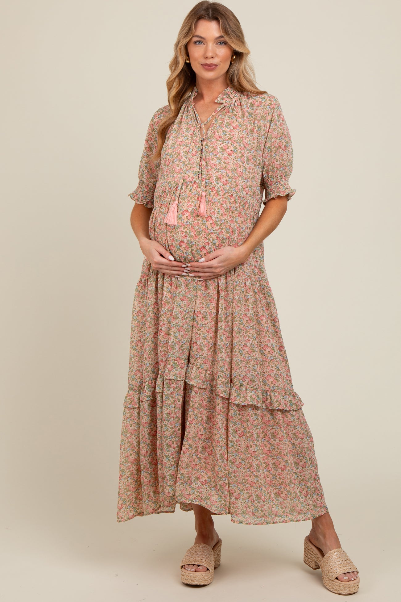 Peach Floral Chiffon Button Front Tiered Maternity Midi Dress
