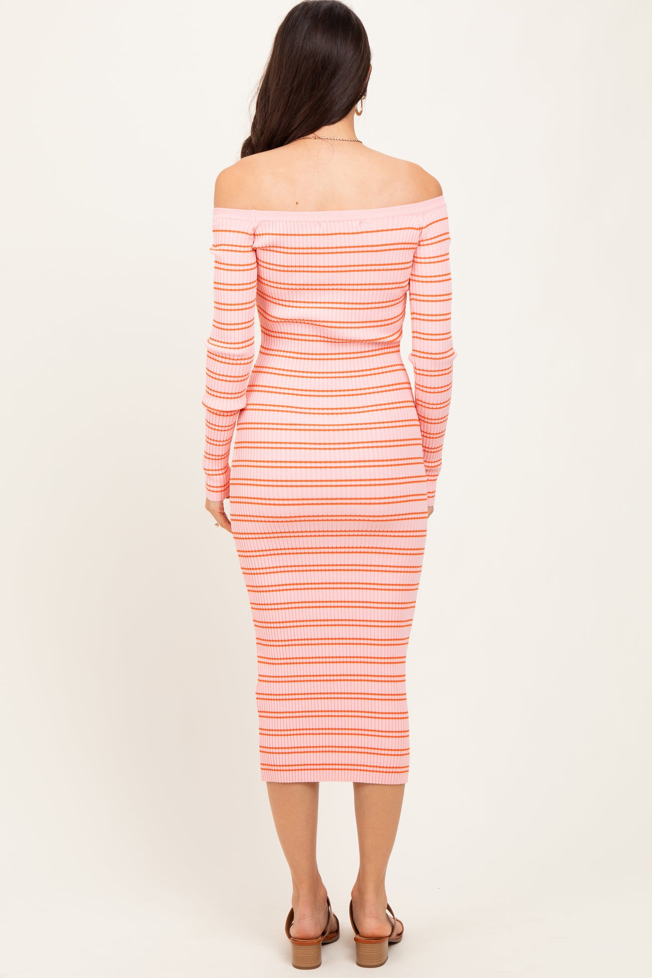 Peach Striped Ribbed Button Accent Off Shoulder Dress