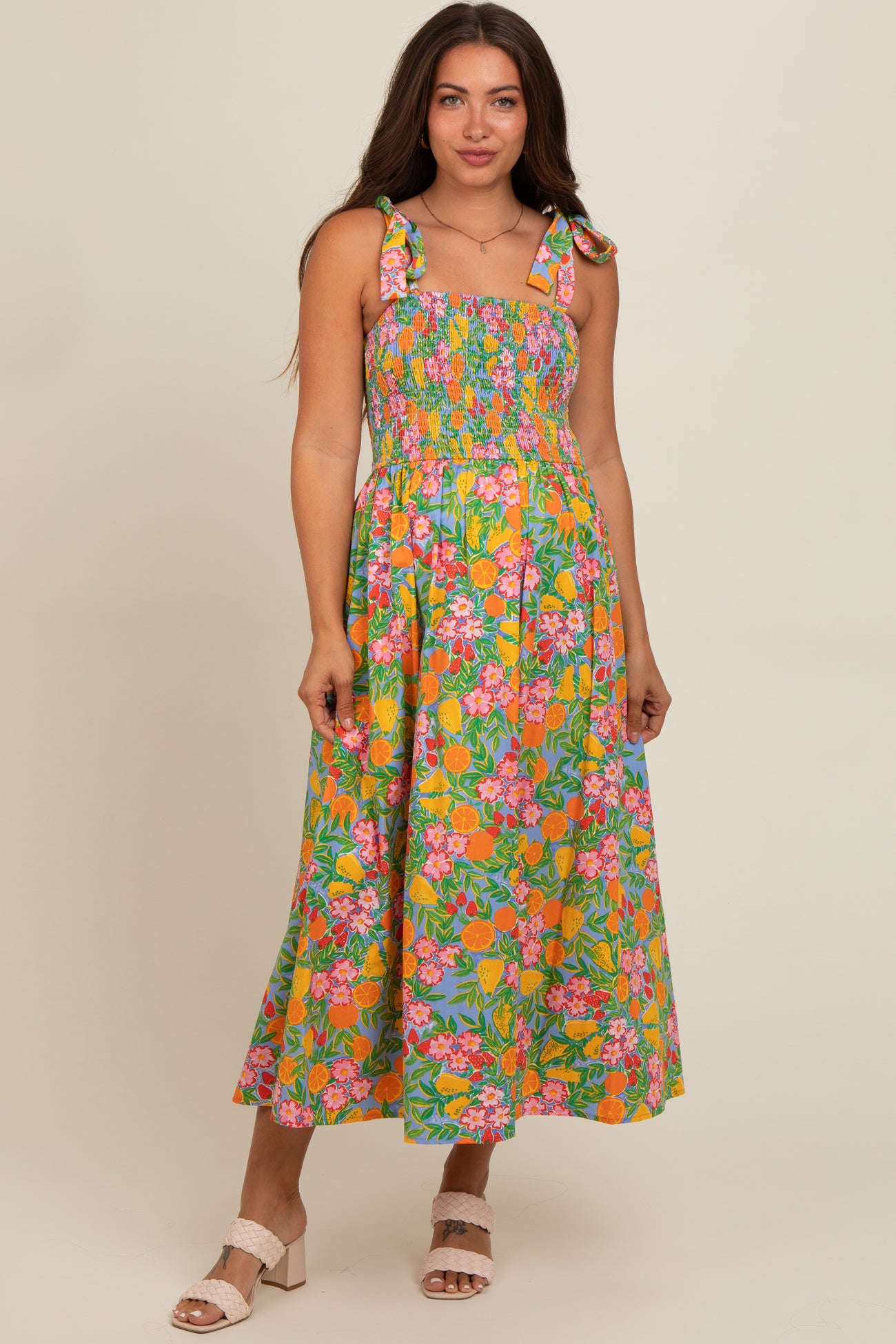 Periwinkle Floral Smocked Shoulder Tie Maternity Maxi Dress