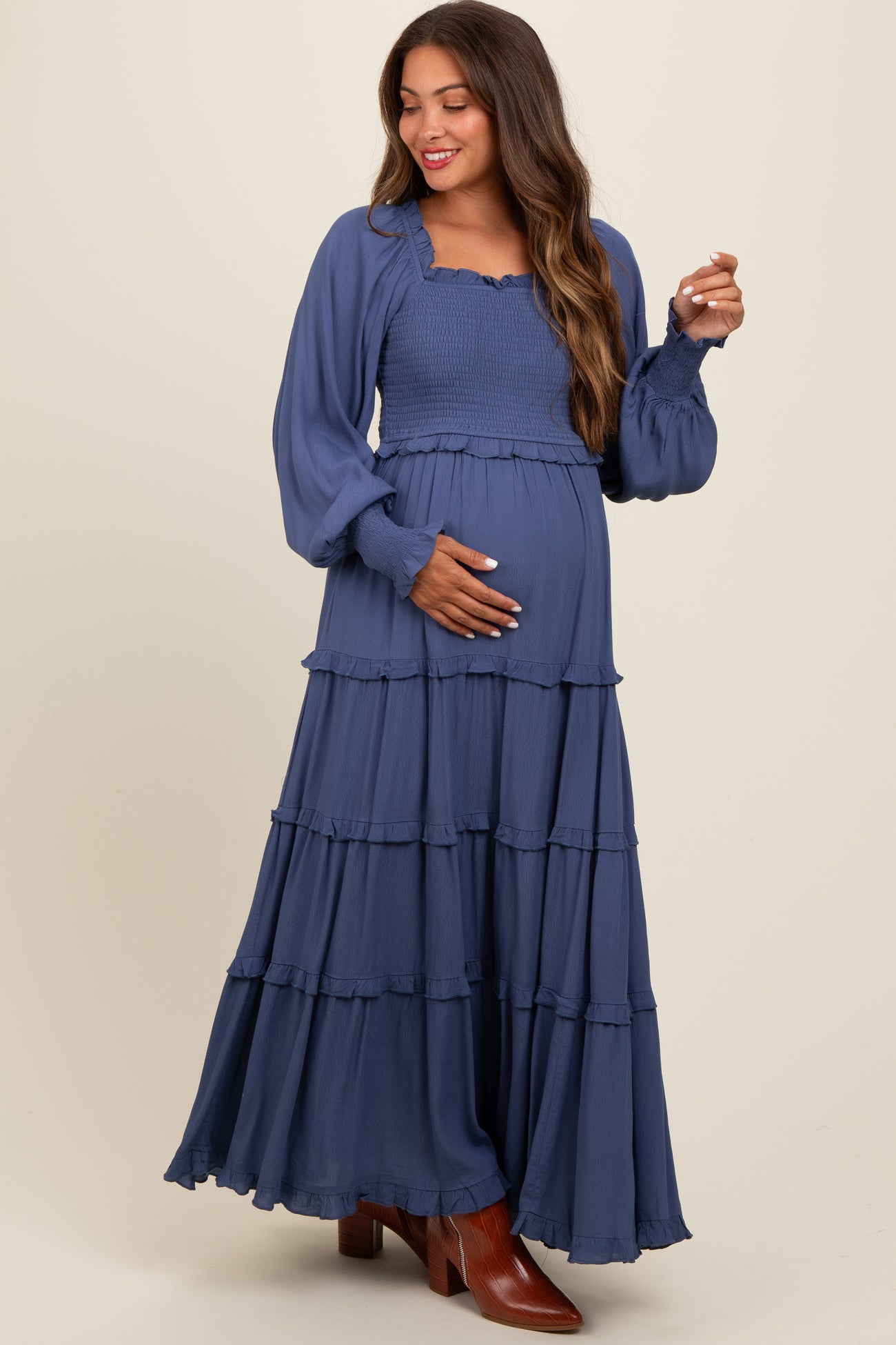 Periwinkle Smocked Long Sleeve Ruffle Tiered Maternity Maxi Dress