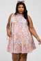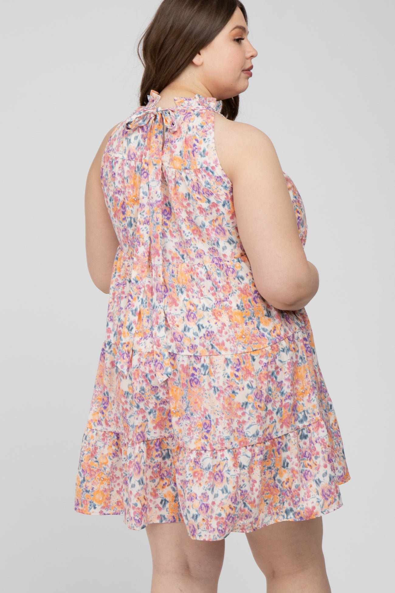 A sleeveless printed maternity plus dress in a tiered body with a high ruffle neckline with tie back. Dress is partially lined.