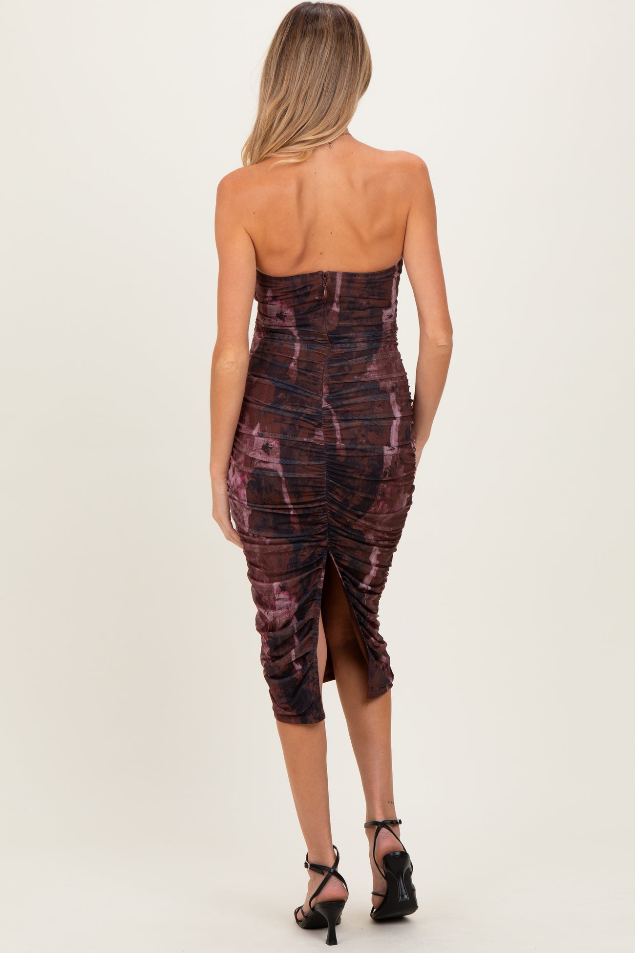 Turn heads with our Pink Brown Tube Ruched Midi Maternity Dress, designed to hug your curves and celebrate your bump in style. This strapless beauty features flattering ruching throughout that allows for flexible fit and added comfort as your belly grows. The rich blend of pink and brown hues creates a trendy, artistic print perfect for special occasions or date nights. Made from a soft, stretchy fabric, this midi dress offers ease of movement while keeping you chic and confident. Pair it with your favorite heels and minimal accessories for an effortlessly elegant maternity look.