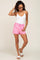Faded shorts with an elastic waistband, a front button closure, five pockets, and a cuffed hem.