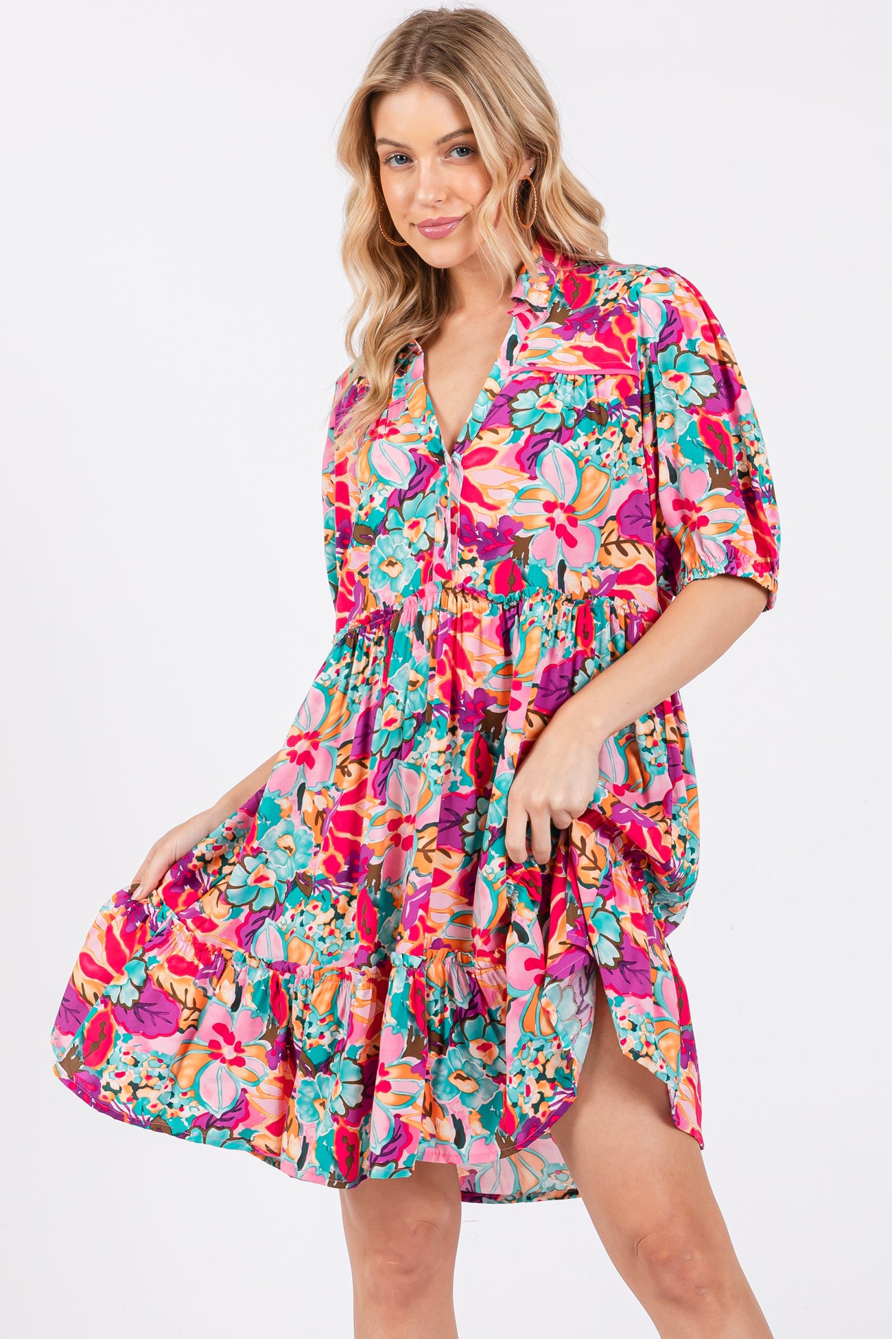 Floral short sleeve maternity dress with front buttons, collard v-neckline, and tiered skirt.
