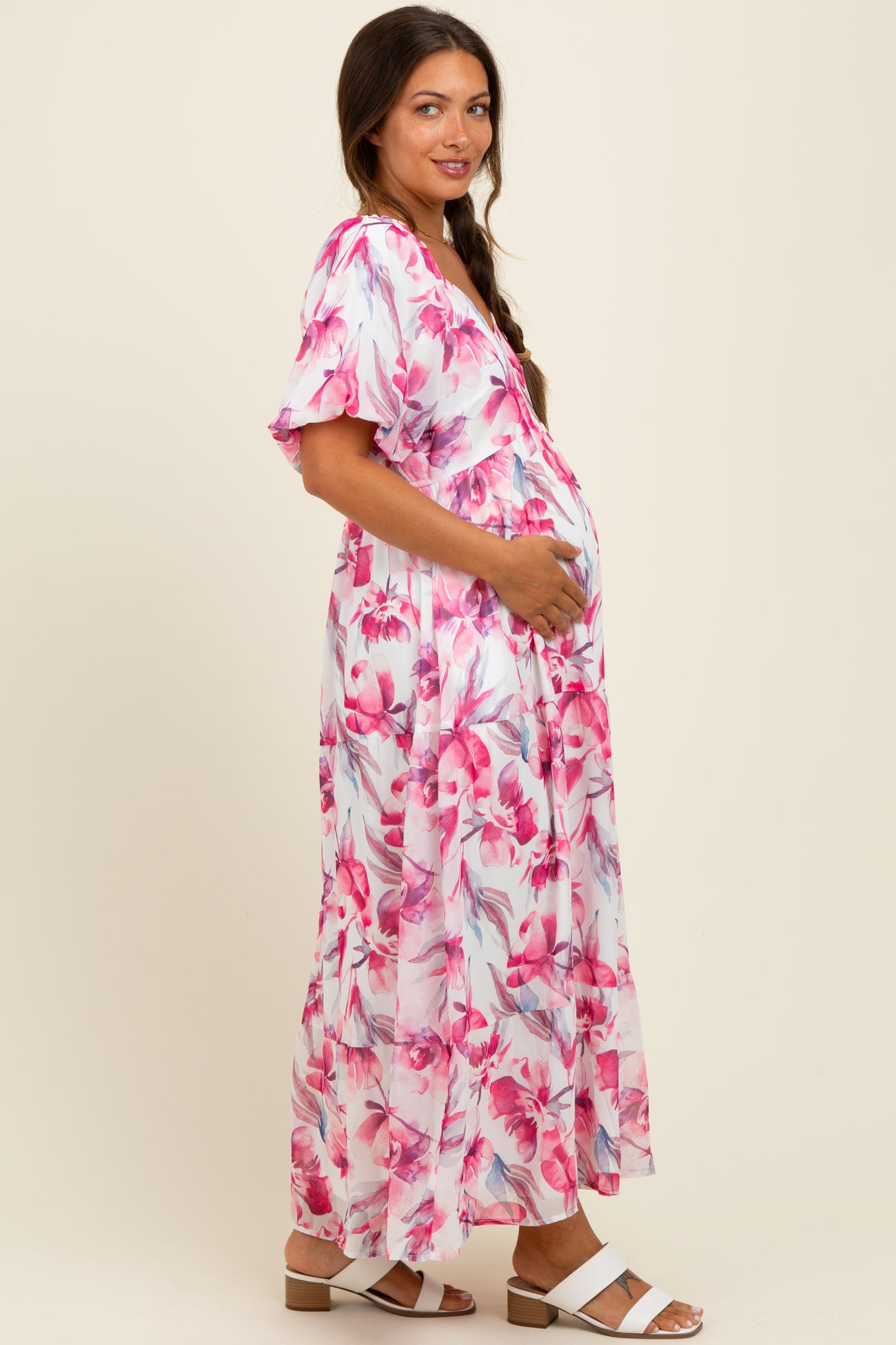 Pink Floral Chiffon Puff Sleeve Maternity Midi Dress