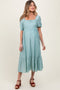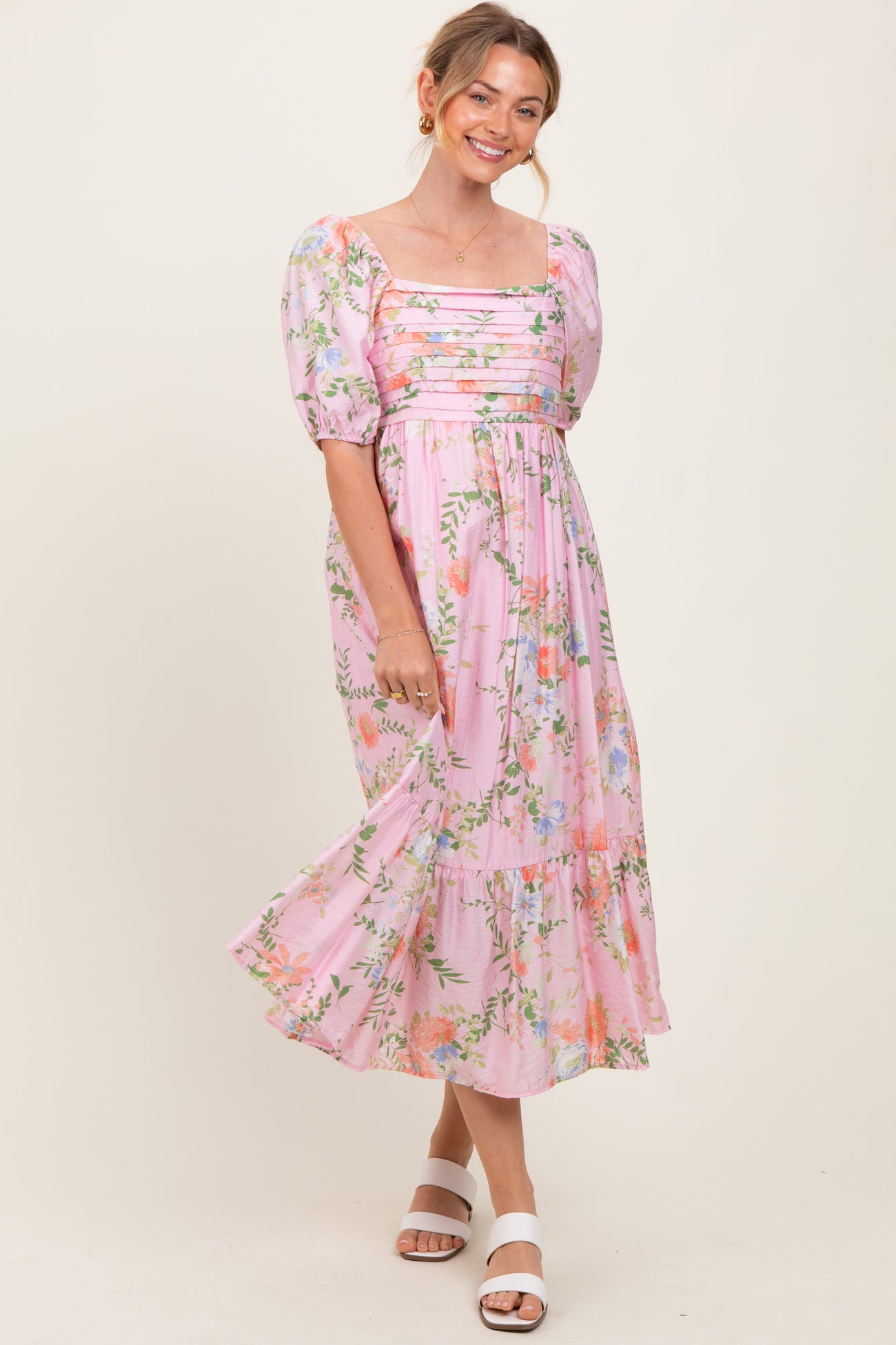 Pink Floral Pleated Bust Puff Sleeve Maternity Midi Dress