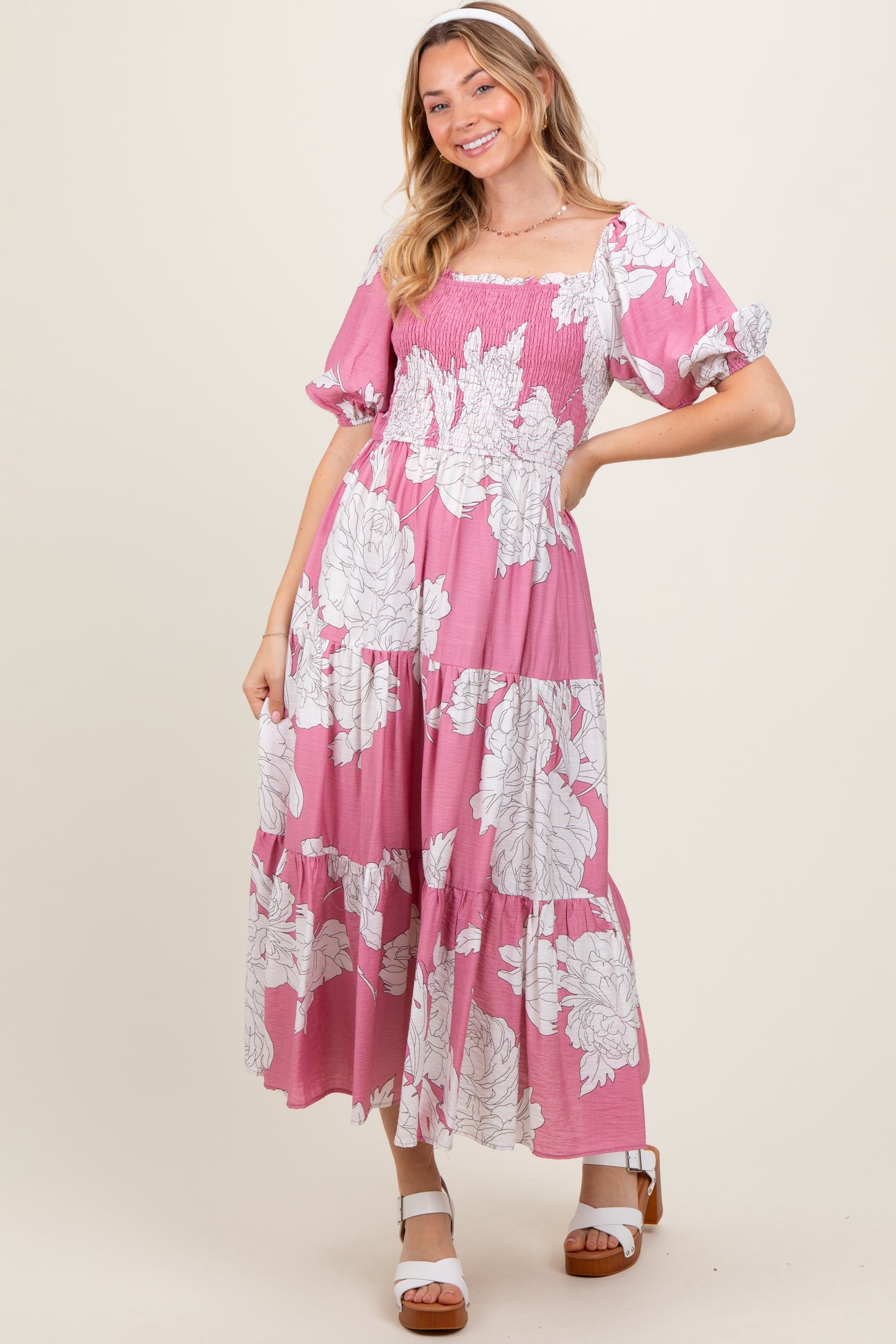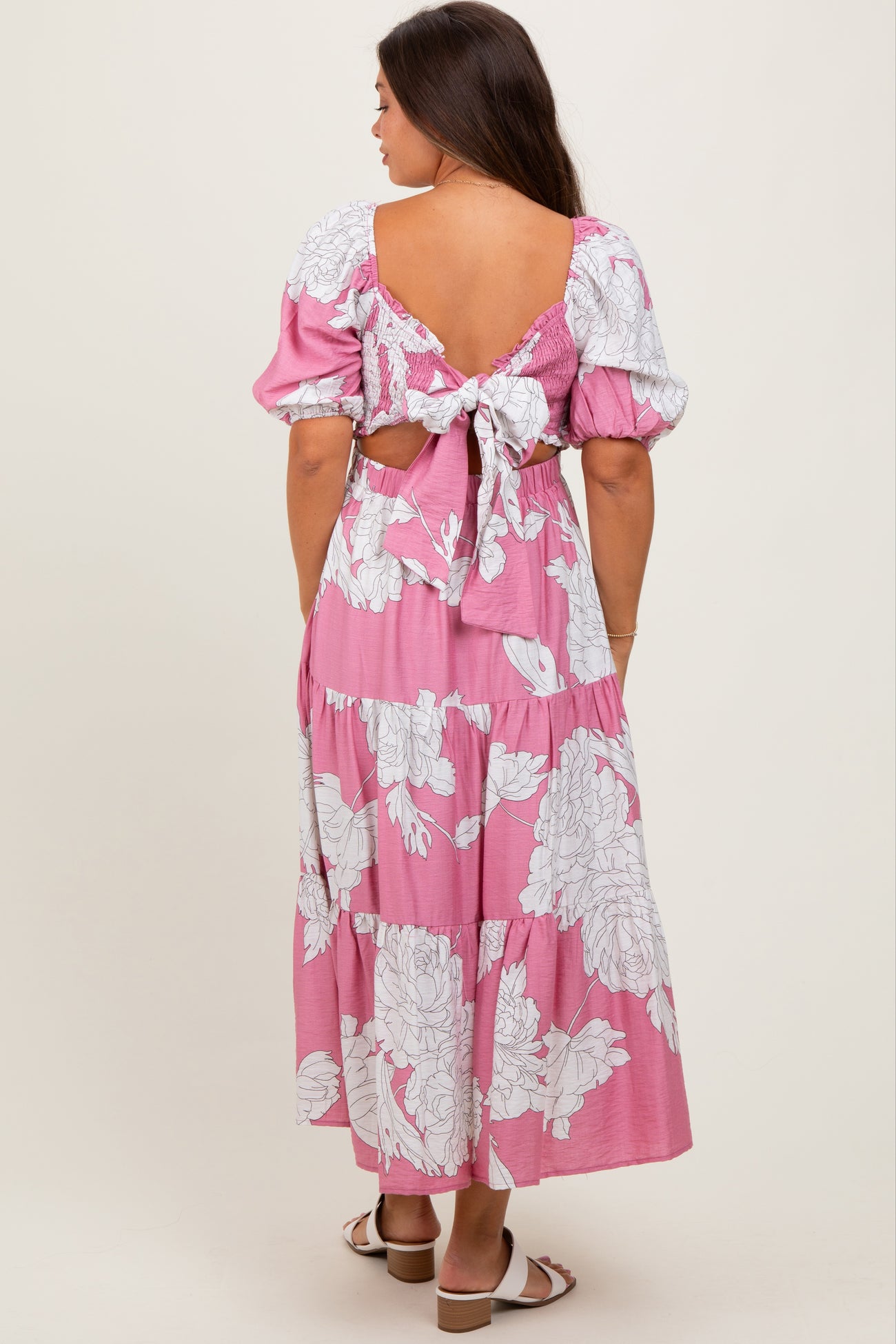 Pink Floral Smocked Front Tie Cutout Maternity Maxi Dress