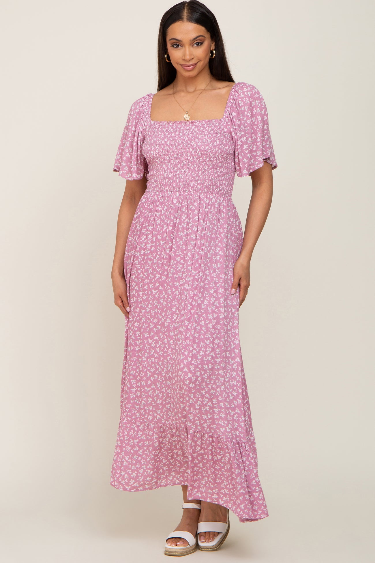 Pink Floral Smocked Midi Dress