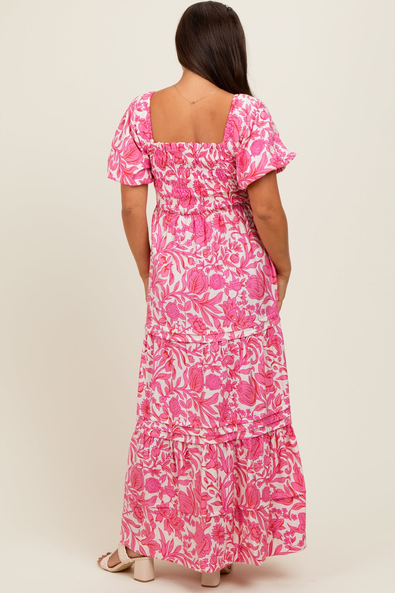 Pink Floral Smocked Puff Sleeve Maternity Maxi Dress