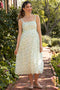 A floral print midi dress featuring a smocked top, short puff sleeves, side pockets, a ruffle hem and a square neckline.
