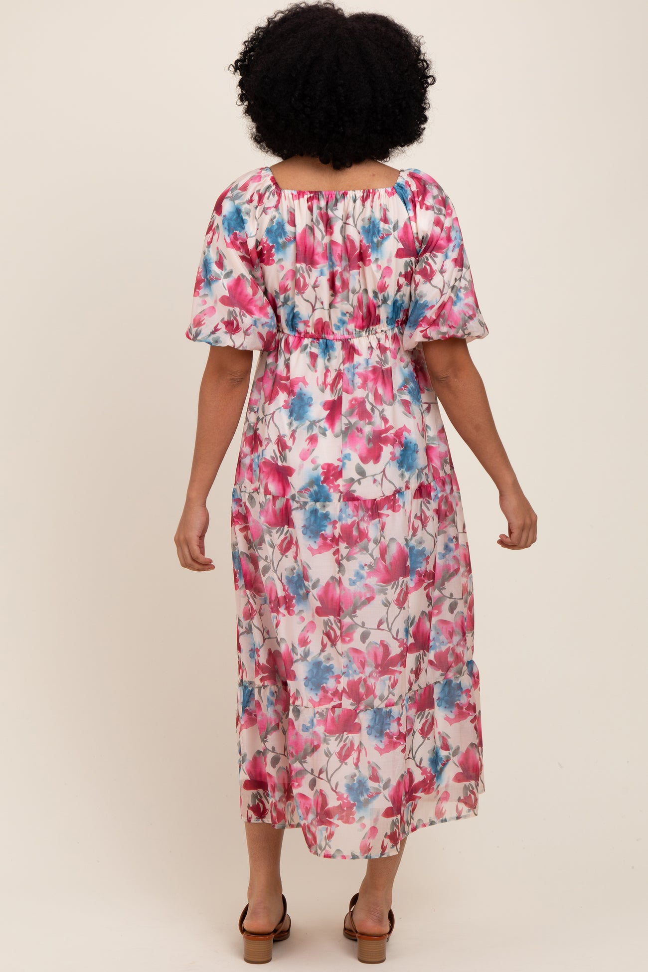 Pink Floral Tiered Puff Sleeve Midi Dress