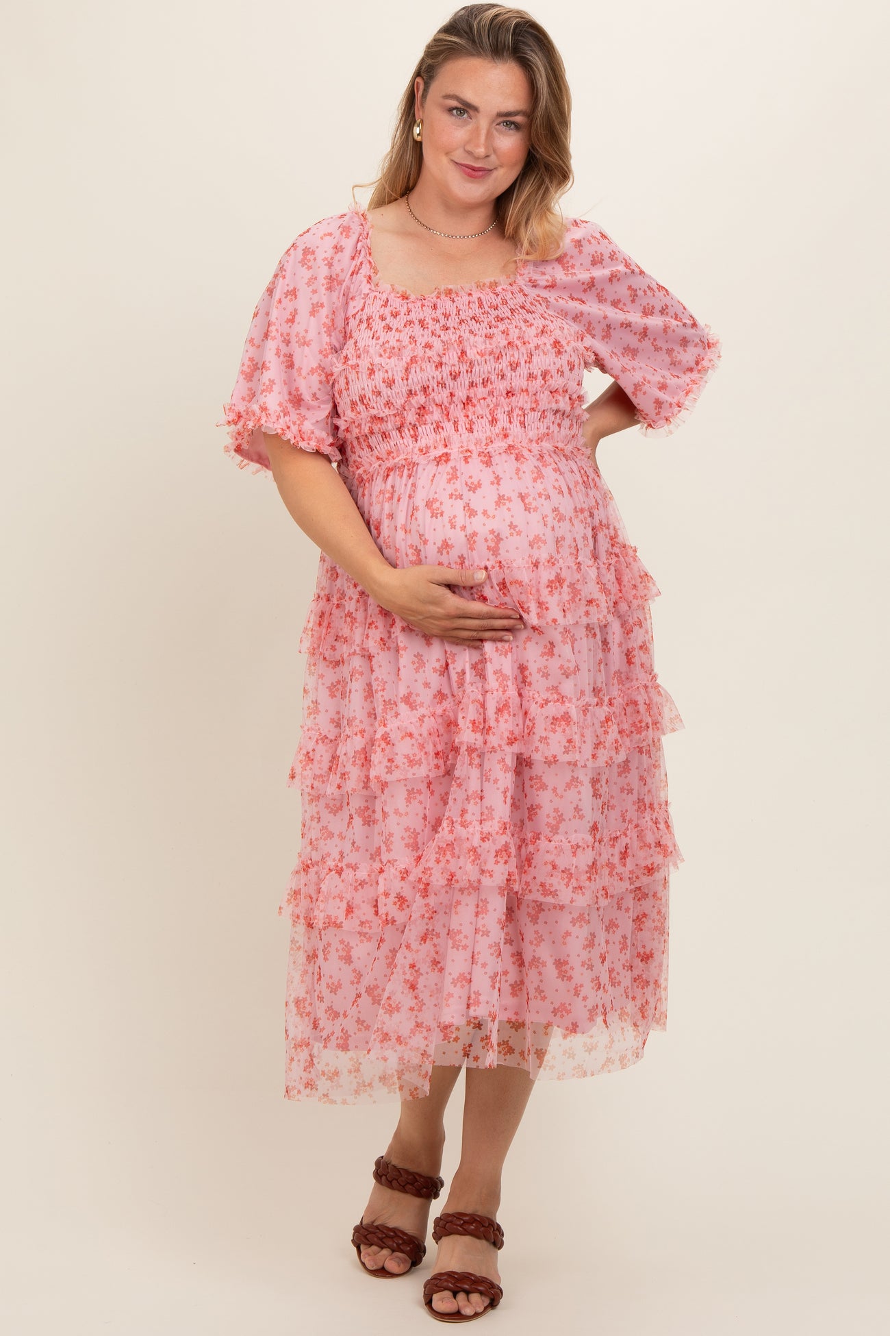 Pink Floral Tulle Smocked Ruffle Tiered Maternity Plus Midi Dress
