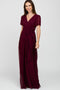 A chiffon maternity plus size maxi dress featuring metallic yarn, a wrap front v-neckline, long sleeves with a three gold button closure a self tie sash, and double lined at the bust and skirt.