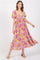 A floral midi dress with a squared neckline, short puff sleeves, a smocked back accent, a back zipper closure, and a gathered bottom tier. Dress is lined half way.