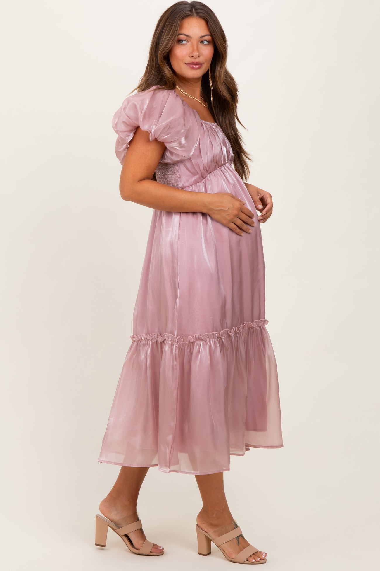 Pink Organza Puff Sleeve Maternity Midi Dress