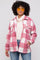 A long plaid shirt jacket featuring a soft brushed material, a collar, long sleeves, front functioning buttons, two front pockets and two side pockets.
