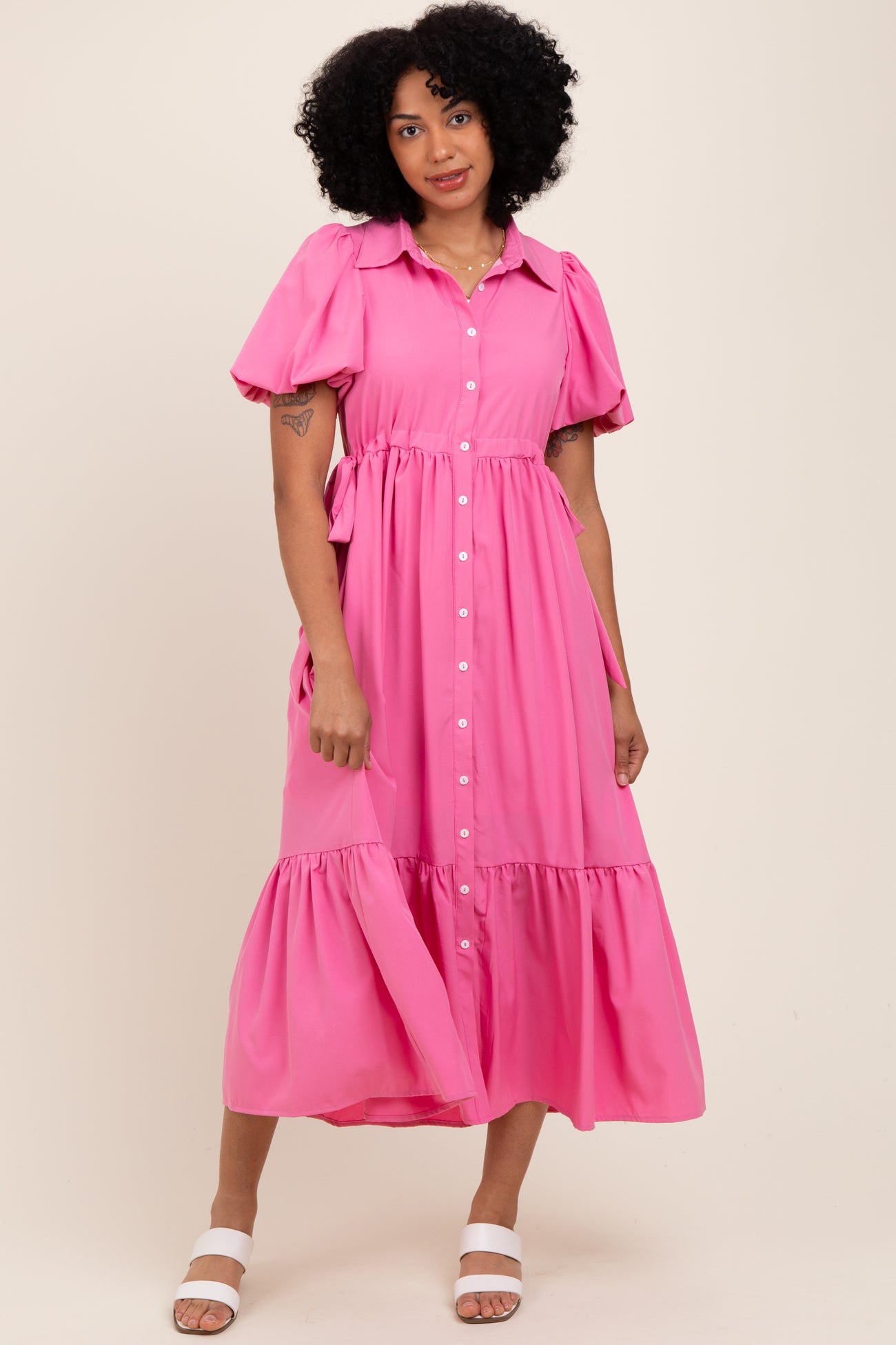 Pink Puff Sleeve Side Tie Midi Shirt Dress