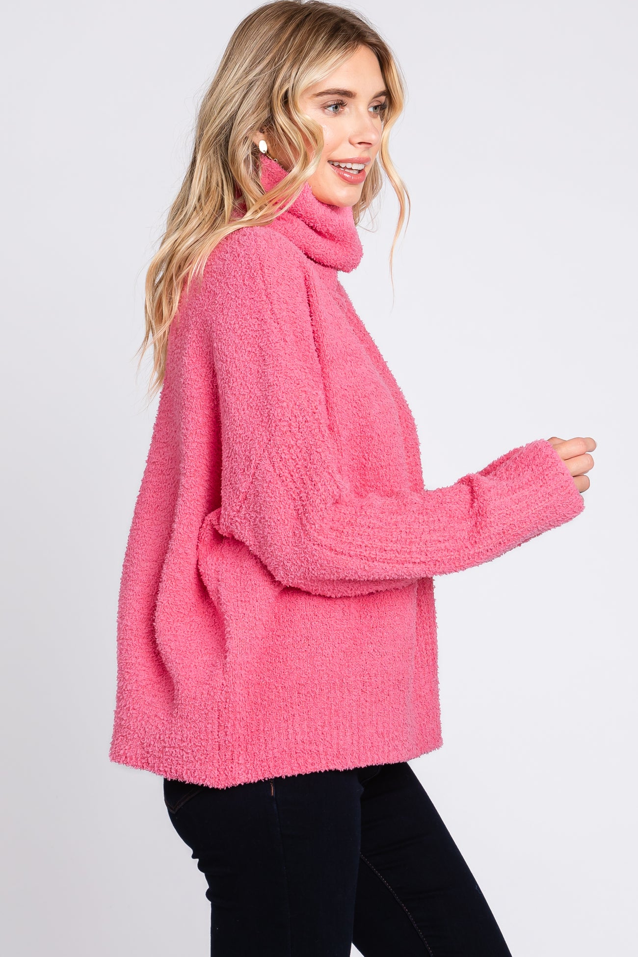Pink Ribbed Boucle Knit Turtleneck Sweater