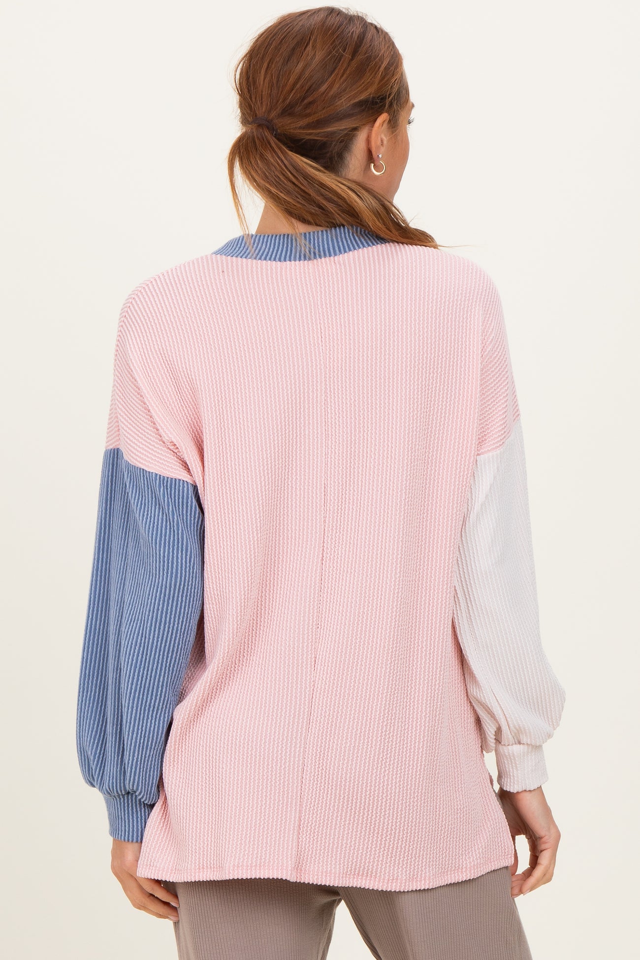 Add a pop of color to your casual wardrobe with this Pink Ribbed Colorblock Side Slit Top. Featuring a soft, textured ribbed knit, this long-sleeve top offers a trendy colorblock design with pink, white, and blue panels. The side slits add a modern touch while ensuring a relaxed, flattering fit. Perfect for everyday wear, pair it with joggers or jeans for a cozy, stylish look. Lightweight, breathable, and effortlessly chic, this top is your new go-to for laid-back style with a fun twist. Available in versatile sizes for a comfortable fit.