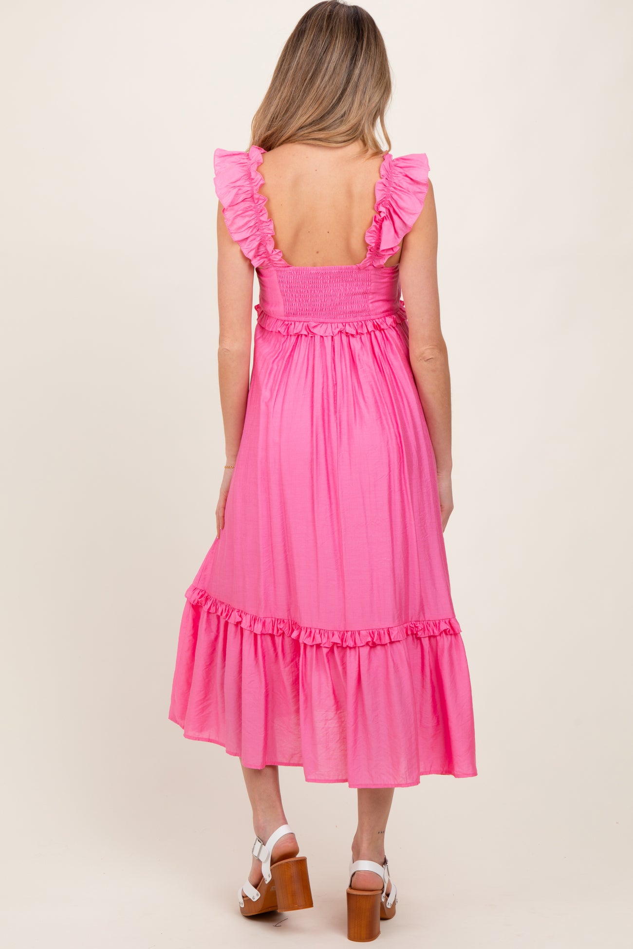 Pink Ruffle Strap Square Neck Maternity Midi Dress