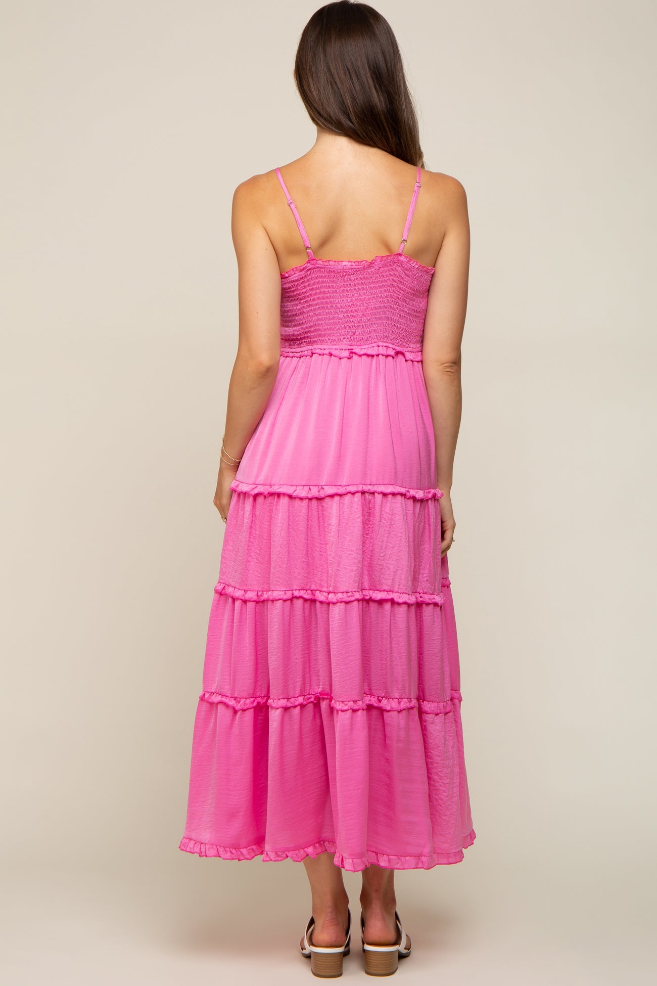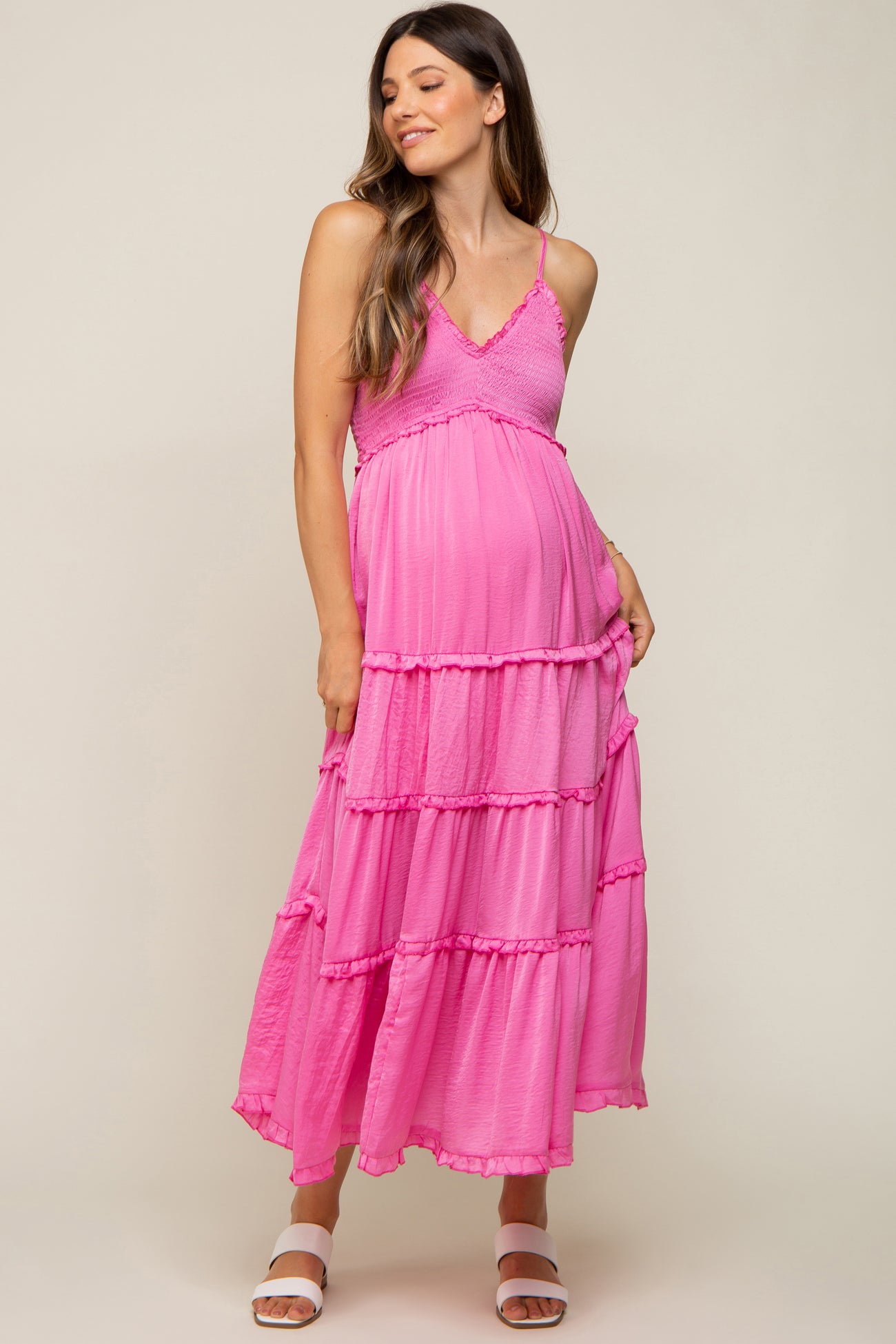 Pink Smocked Ruffle Tiered Maternity Maxi Dress