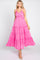 A maxi dress with a ruffle accent v-neckline, adjustable straps, a smocked top, and ruffle accent tiers. Skirt is partially lined.