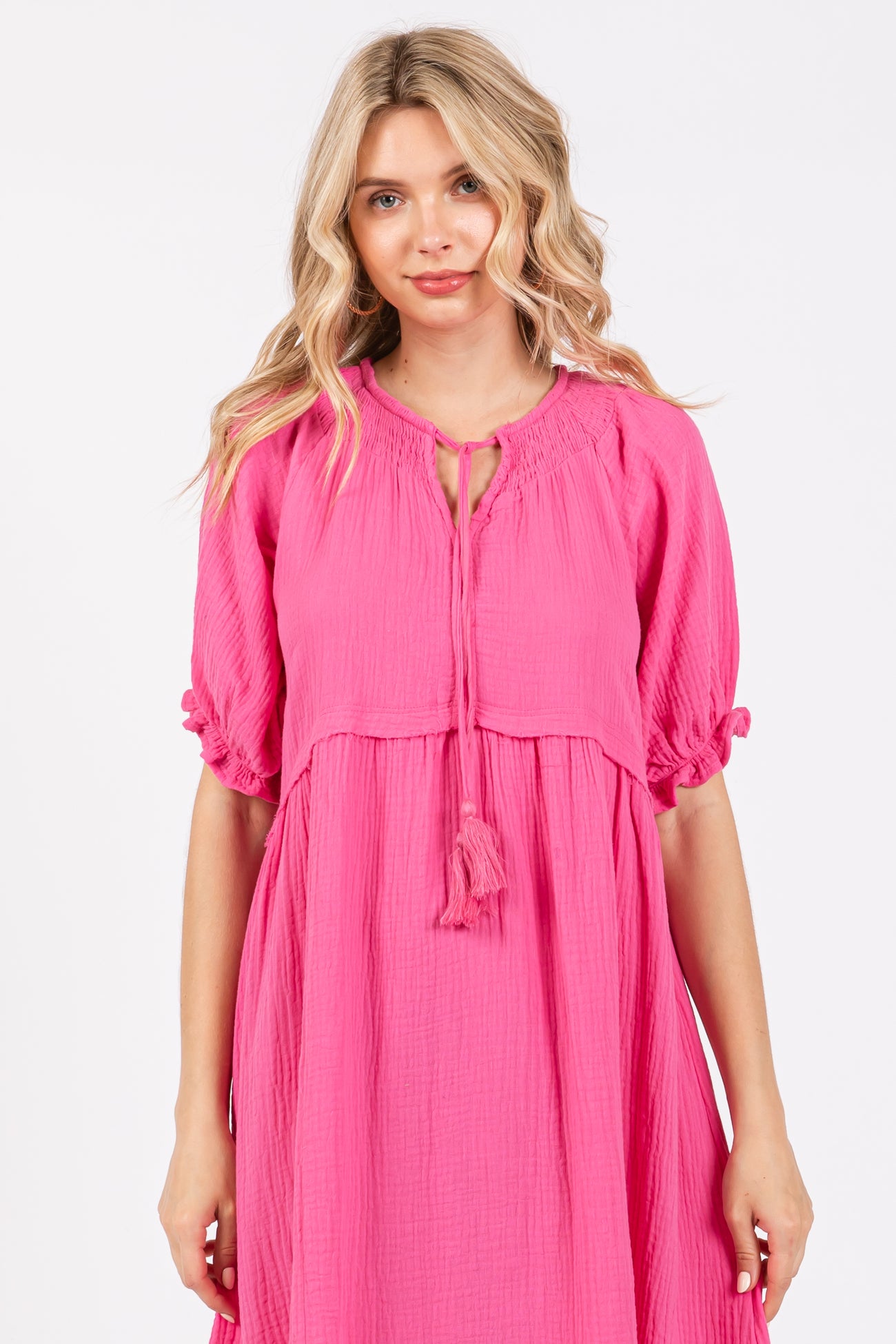 A solid midi dress with puff sleeves, v-neckline and tassel tie detail and ruffle hem.