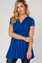 A draped front maternity top featuring a v-neckline, short sleeves, and cinching under bust.