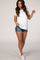 A solid hue maternity denim short featuring, a light wash, distressing, a raw hem and an elastic belly band.