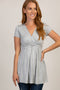 A draped front maternity top featuring a v-neckline, short sleeves, and cinching under bust.