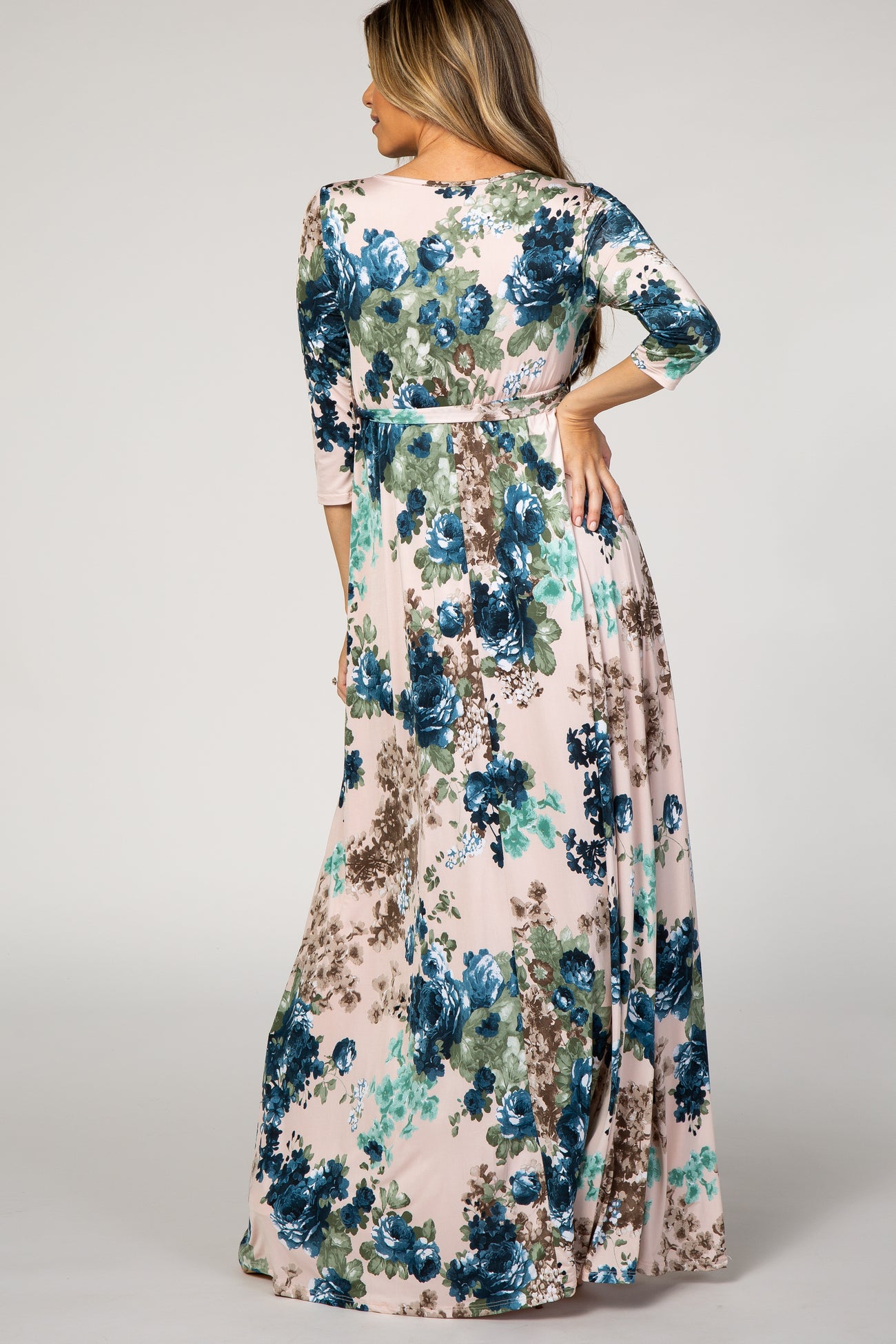 A floral printed maxi dress featuring a draped v-neckline, 3/4 sleeves, and a sash tie.