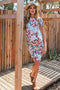 Floral printed maternity maxi dress. Sleeveless. Cinched at waist. Rounded neckline.