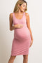 A sleeveless maternity dress featuring a solid hue, a rounded neckline, and ruching on the sides for a form-fitting silhouette.