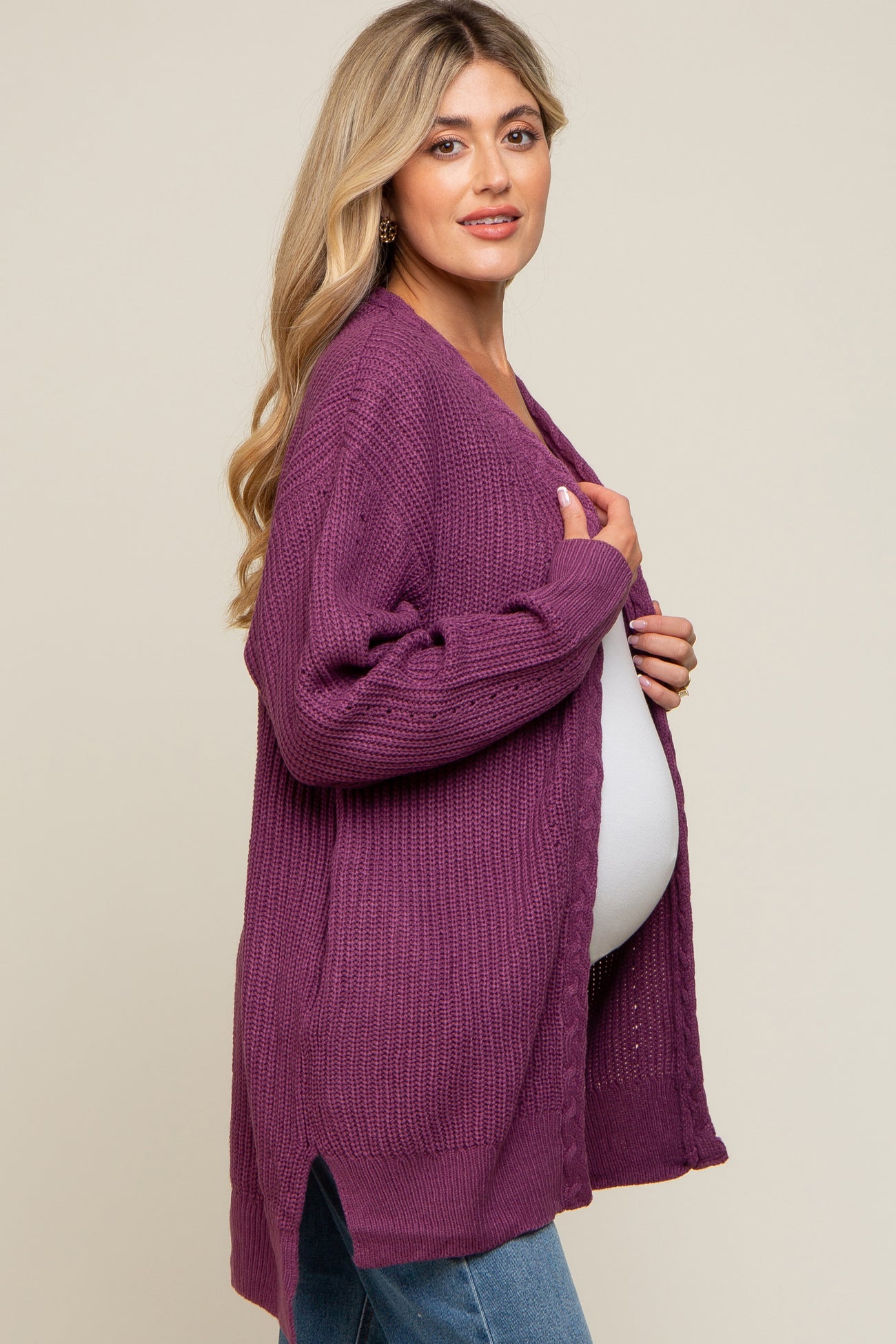 A solid chunky knit maternity open front cardigan with a cable knit accent. Pocketed.