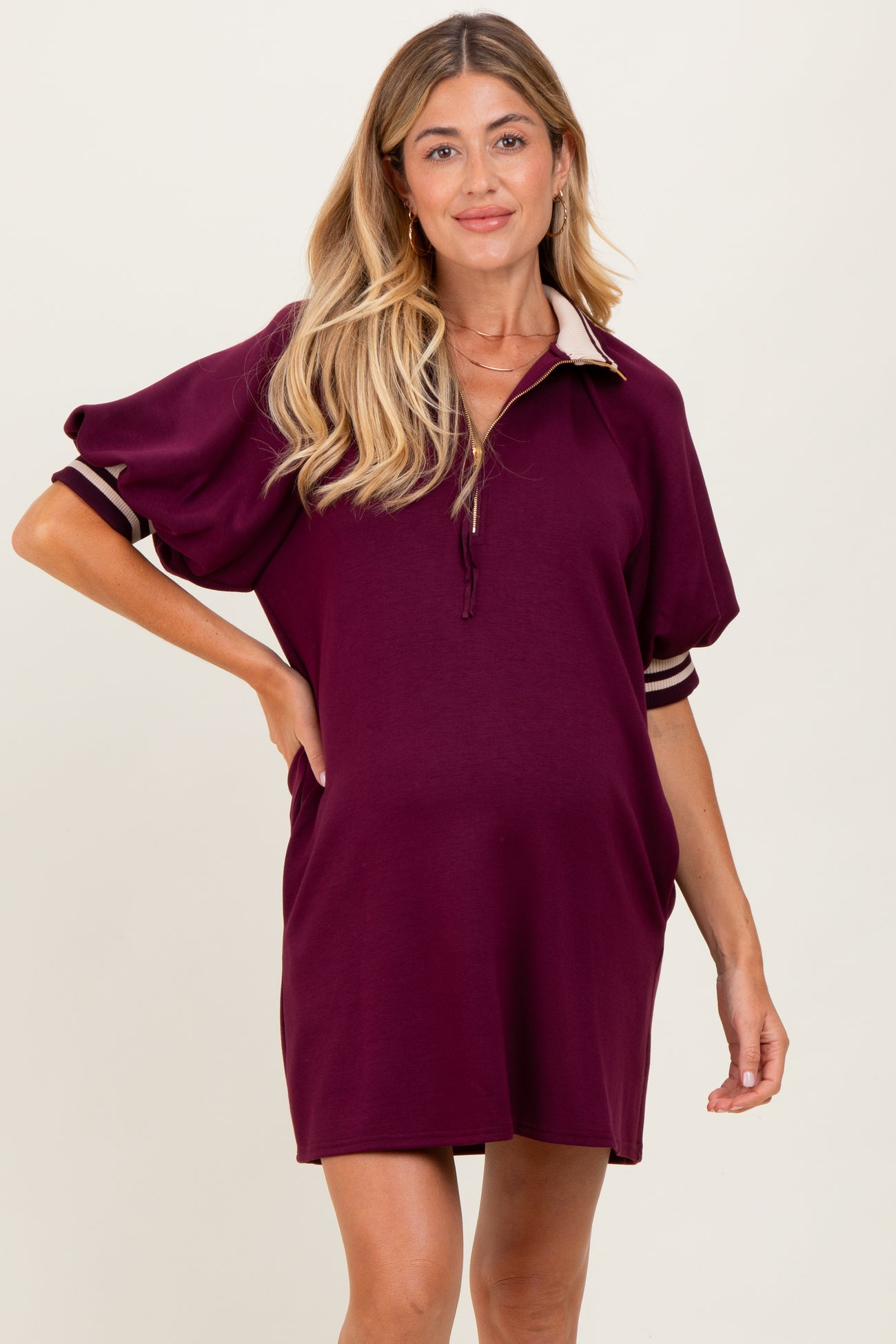Plum Half Zip Puff Sleeve Maternity Mini Dress