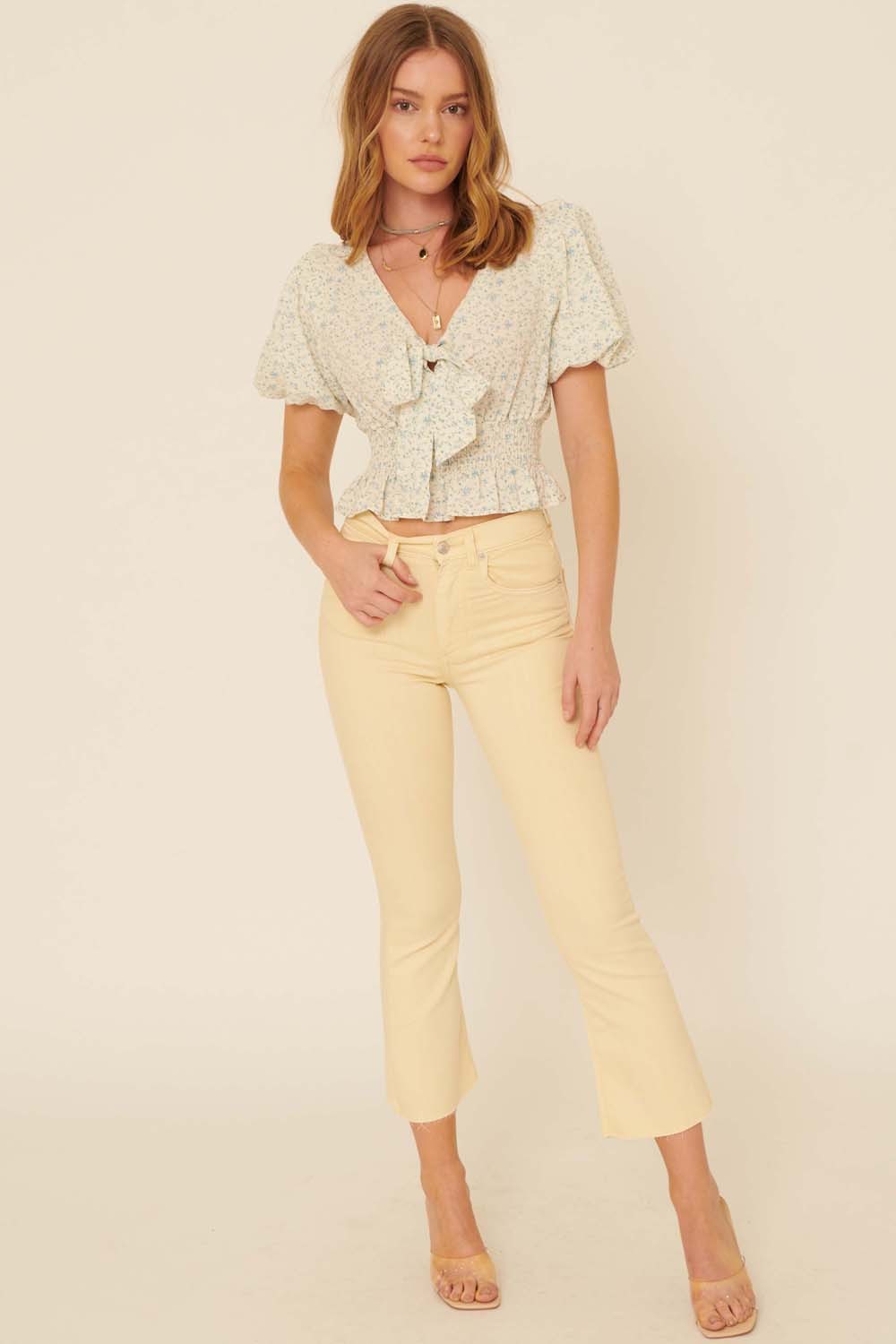 Powder Blue Floral V Neck Puff Sleeve Smocked Cropped Top