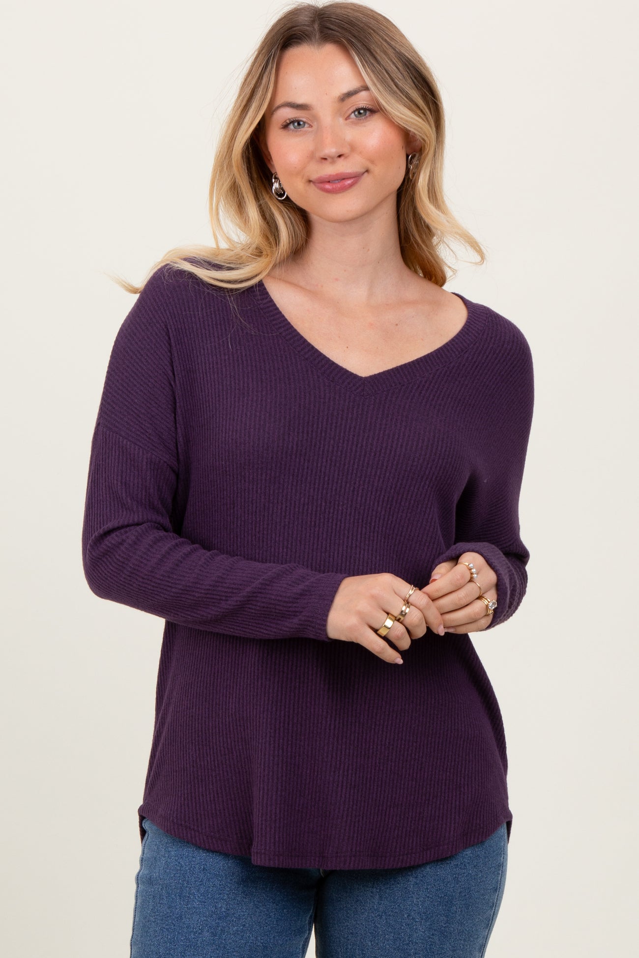 Purple Basic Brushed Rib V-Neck Maternity Top